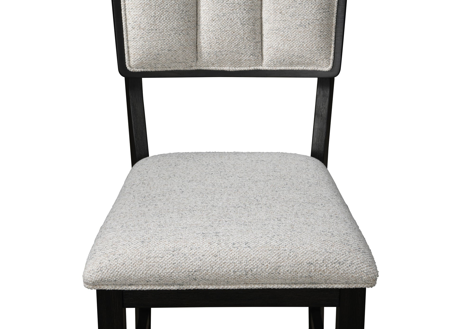 This counter-height dining group embodies a chic, contemporary style with its sleek design and elegant finishes. The ensemble features a robust, round table with a striking wood veneer top that showcases the natural grain, adding a warm, organic touch to the modern silhouette. The table is thoughtfully designed with an integrated turntable, drop leaves and built-in shelving, providing a convenient storage solution for dining essentials. Surrounding the table are high-back chairs, upholstered in a textured, light fabric that contrasts beautifully with their dark wooden frames, offering comfort and sophistication.
