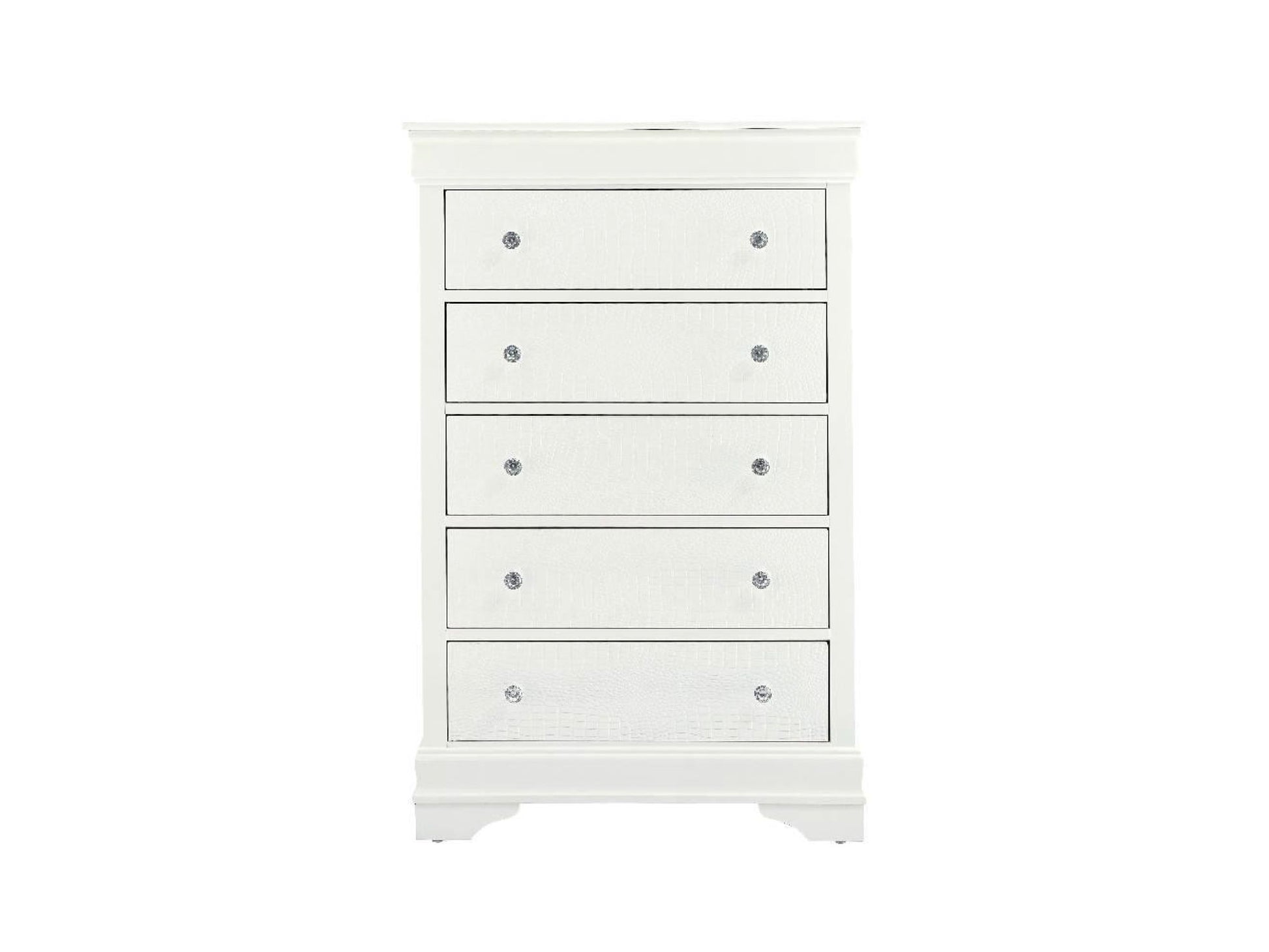 GLOBAL Pompei 5 Drawer Chest with Crystal Drawer Knobs, Spacious Drawers, French Dovetail Box, Textured Detail, Color: Metallic White