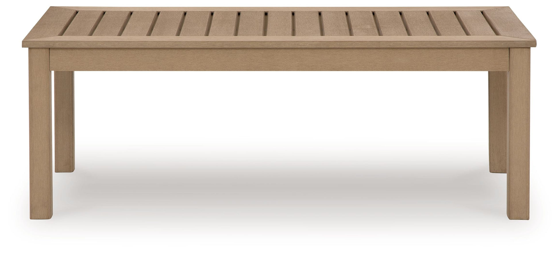This coffee table is a beautiful addition to any outdoor living space. Effortless in its simplicity, this piece echoes your easygoing sensibilities. Combining durable, cutting-edge engineered materials, its Weatherwood construction in a blond wood color enhances the contemporary design. Pair this table with the matching sofa and chairs for a spectacular backyard or patio seating arrangement.