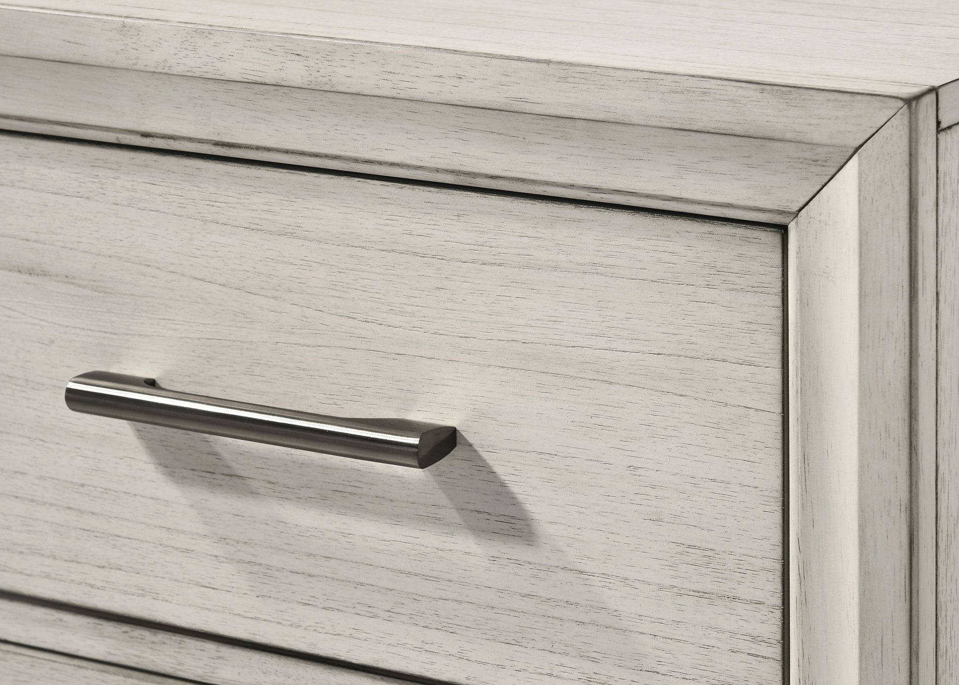 This bedroom set offers a sleek and stylish update to any space, featuring a white mist finish that commands attention while maintaining a sense of warmth and coziness. The bed stands as the stunning centerpiece, with its high, padded headboard upholstered in a plush fabric that invites relaxation and comfort. Flanking the bed are matching nightstands, providing convenient access to storage and display space. The set is rounded out with a capacious dresser, accented with a broad mirror that adds depth and brightness to the room.