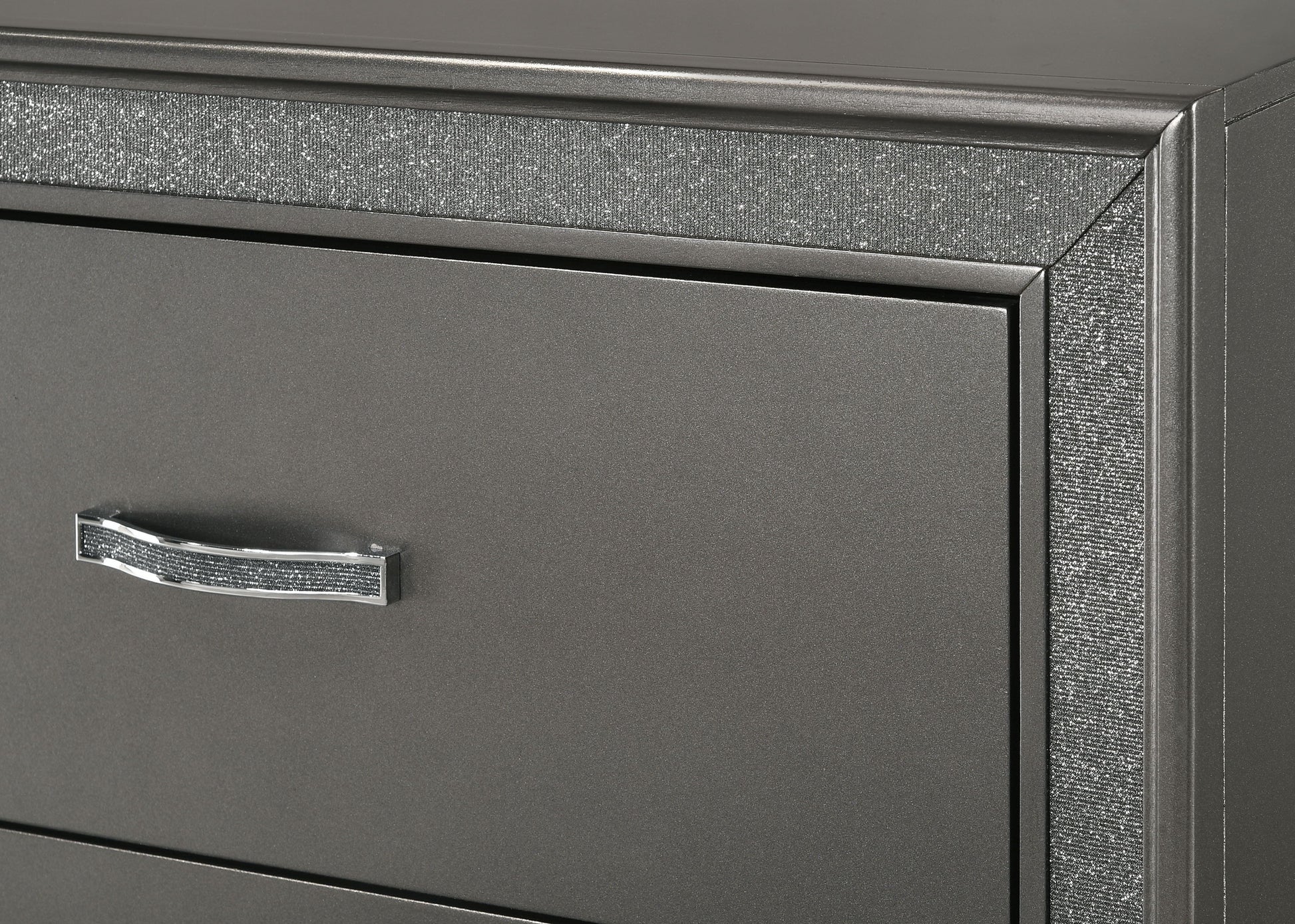 This luxurious bedroom collection exudes opulence with its dark, shimmering finishes and plush, tufted upholstery. The bed is a showstopper, featuring a high, tufted headboard that invites you to recline in comfort and style. Accompanying the bed are a matching dresser and chest, each boasting a sparkling trim that frames the rich, dark panels and complements the sleek, contemporary handles. The nightstand echoes the elegance of the bed, providing a convenient bedside space that doesn't skimp on glamour. Topped off with a generously sized mirror, the dresser completes this ensemble, reflecting both light and refined taste.