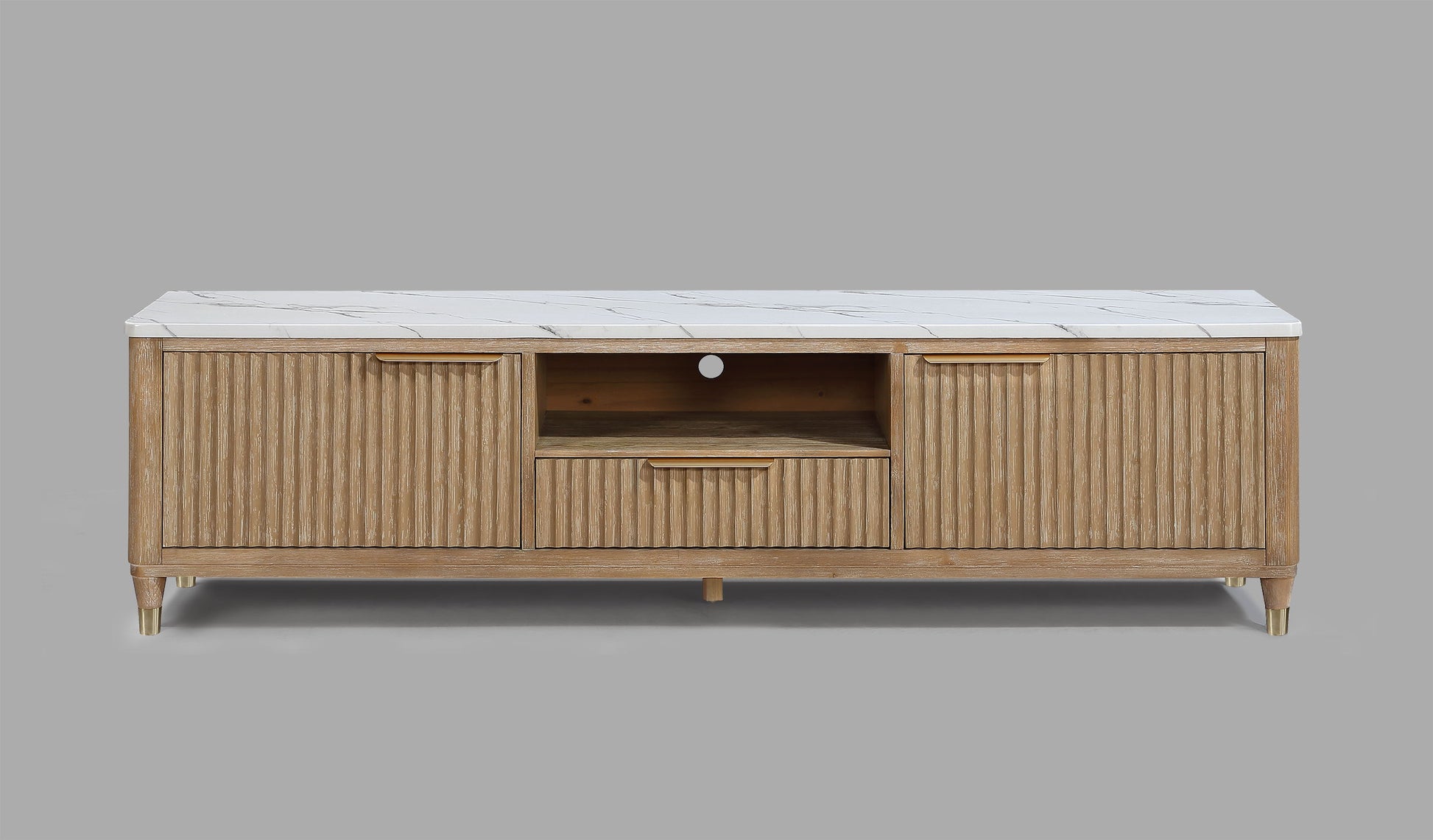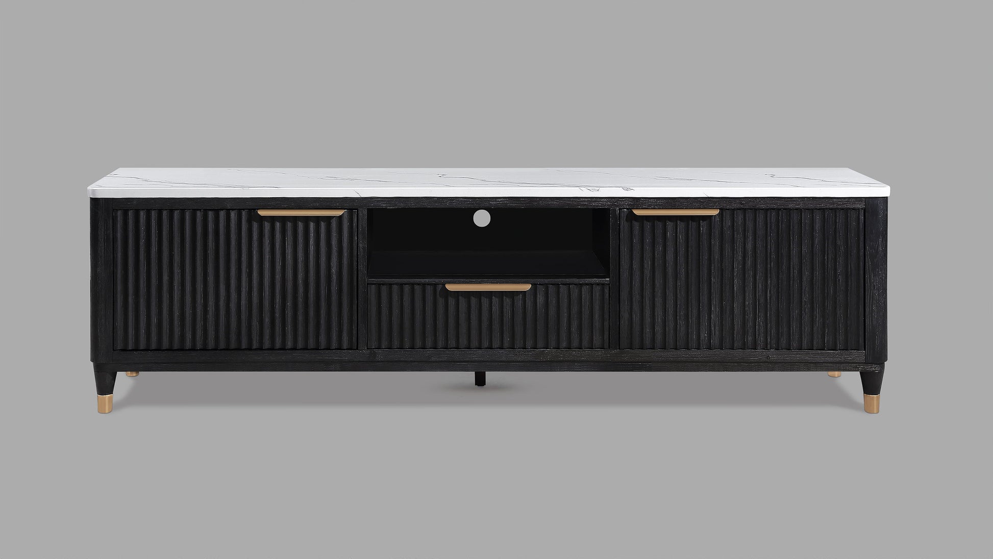 This entertainment console brings modern luxury and sleek sophistication to any living space. Featuring a striking contrast, fluted wood facade with a pristine faux marble top, this piece embodies refined elegance. Brass-tone accents and tapered legs add a touch of mid-century flair, enhancing its chic, upscale appeal. With generous storage space behind its textured doors and an open center shelf for easy access to media components, this console is as functional as it is stylish. Ideal for contemporary interiors, it’s the perfect blend of high-end design and everyday practicality, making it a standout addition to your home decor.