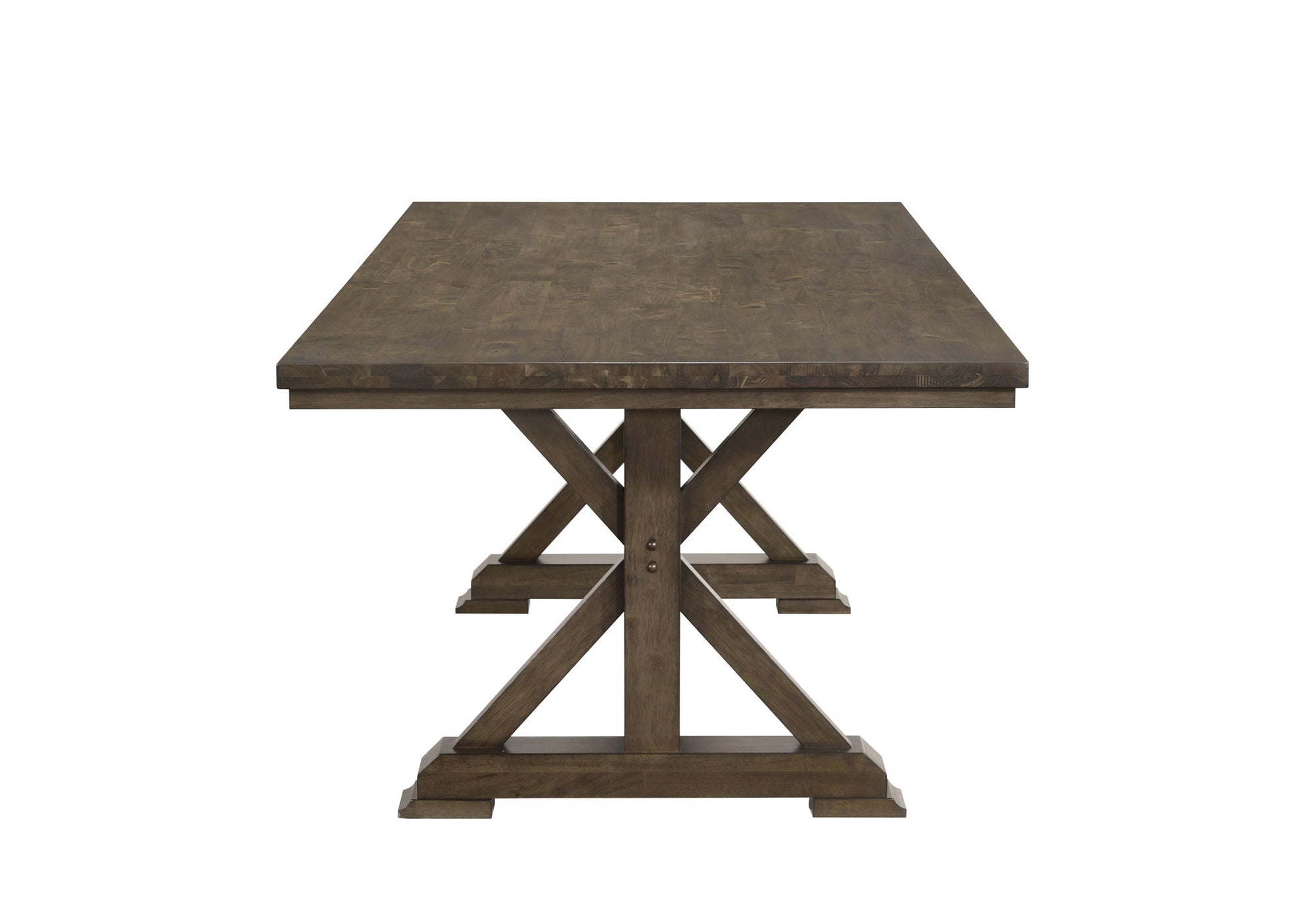 Elevate your dining experience with this beautifully crafted dining set, where rustic charm meets modern sophistication. Designed to bring warmth and style to any space, the sturdy table features a bold trestle base that exudes farmhouse appeal while providing exceptional stability. The matching counter-height chairs and bench offer a sleek slat-back design and plush upholstered seats, ensuring both comfort and elegance. Perfect for casual meals or entertaining guests, this elevated dining collection creates an inviting atmosphere that blends seamlessly with contemporary, industrial, or rustic interiors.